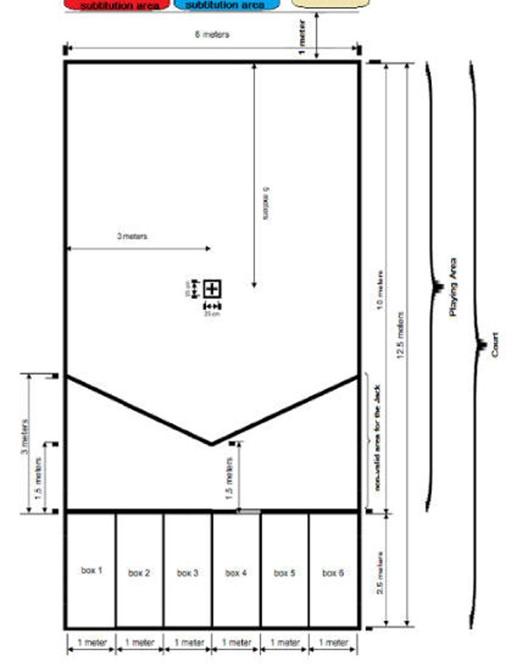 - Pelikenttä on sisällä 6 x 10 m, ulkona 6 x 15 m. Rajat merkitään 2-4 cm levyisellä teipillä
